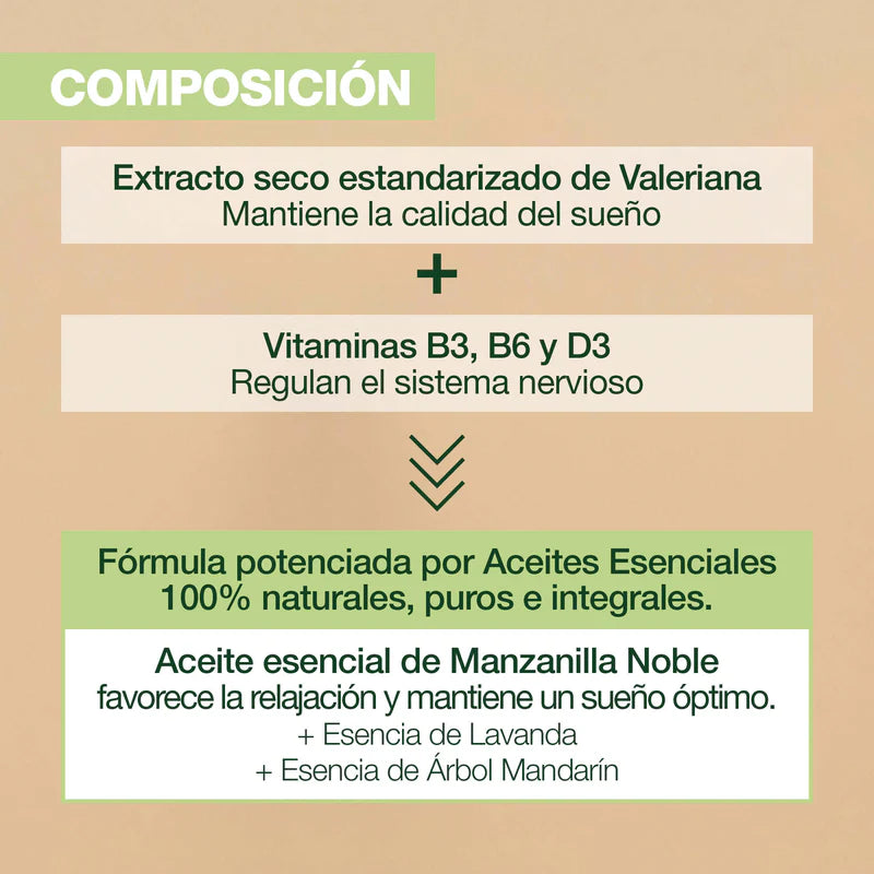 Las cápsulas Aromaboost SLEEP obtienen su poder del extracto seco estandarizado de valeriana, las vitaminas B3, B6 y D3. La fórmula se potencia con una sinergia experta de aceites esenciales de manzanilla noble, lavanda verdadera y esencia de mandarina.