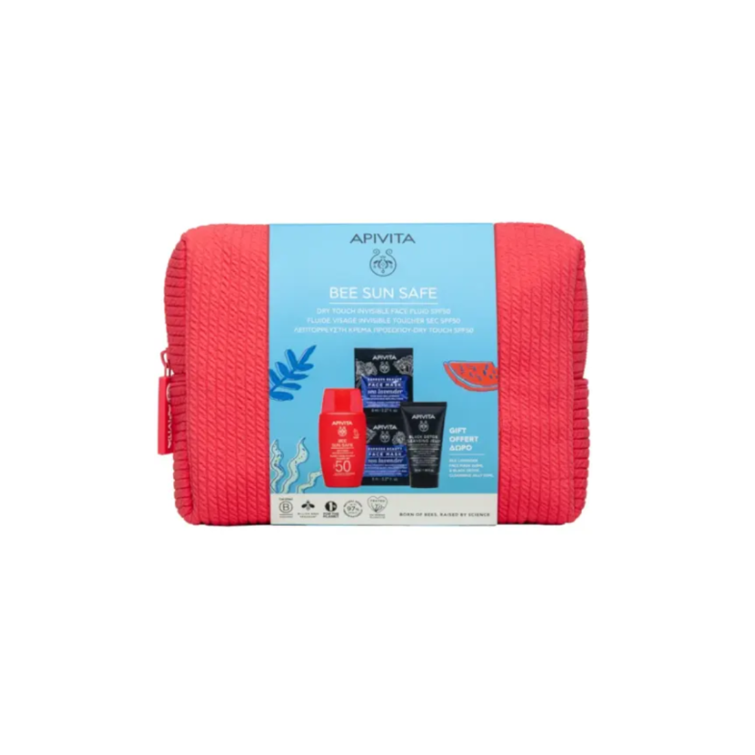 Apivita Bee Sun Safe Fluido Facial Invisible Toque Seco SPF50, Fotoprotector facial fluido de rápida absorción para conseguir una alta protección frente a UVA, UVB, IR y luz azul al mismo tiempo que deja la piel fresca e hidratada. Ofrece un acabado empolvado con efecto de piel "desnuda". Formulado con ingredientes biodegradables.
