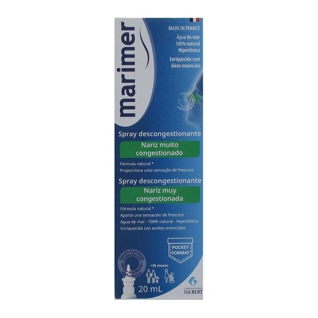El Marimer Spray Nasal Descongestionante con Aceites Esenciales 20 ml es un spray nasal formulado con agua de mar 100% natural y enriquecido con aceites esenciales. Su concentración hipertónica (22 g/L de sales) actúa por efecto osmótico, descongestionando la nariz y facilitando la evacuación de las secreciones nasales. Los aceites esenciales de eucalipto, menta de campo y manzanilla romana, junto con un extracto de propóleo, calman la mucosa nasal y reducen la hinchazón, proporcionando una sensación de frescor y respiración nasal libre.