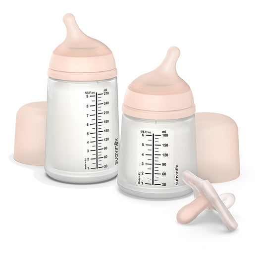 Pack con dos biberones Zero Zero: un Biberón de 180 ml con tetina de flujo Adaptable y un Biberón de 270 ml con tetina de flujo Medio, y un Chupete Zero Zero talla 0-6 meses, ¡la mejor opción para la lactancia mixta!